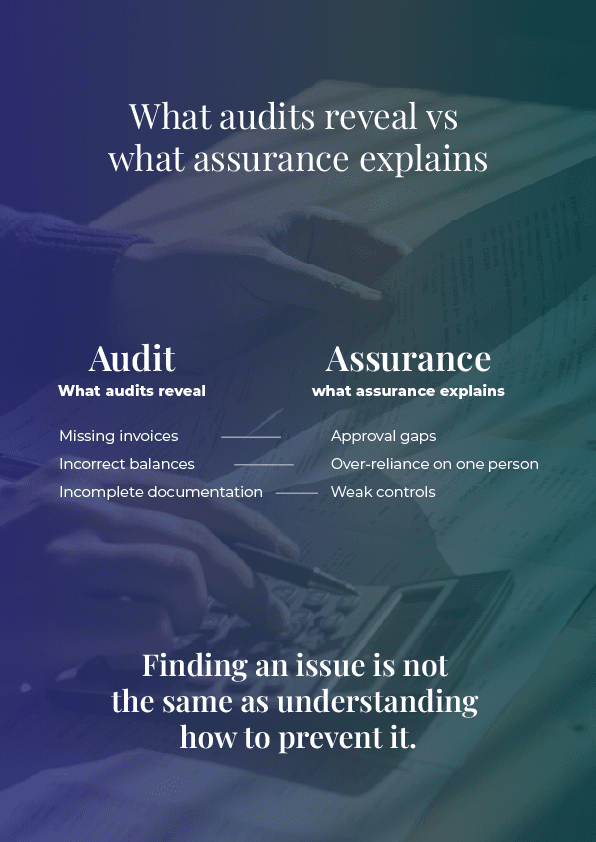 This is the difference that matters for boards when comparing assurance vs audit.. The audit tells you what does not line up. The assurance explains how the issue formed and what part of your process needs support. Together they tell a whole story, but each one answers a different question.