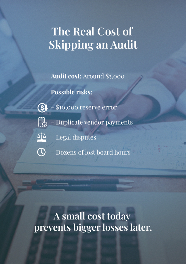 A standard HOA audit typically costs around $3,000, which feels like a significant amount of money, especially for smaller associations. Some boards put off audits because the cost puts them off, but the price of skipping one can end up being much higher.
