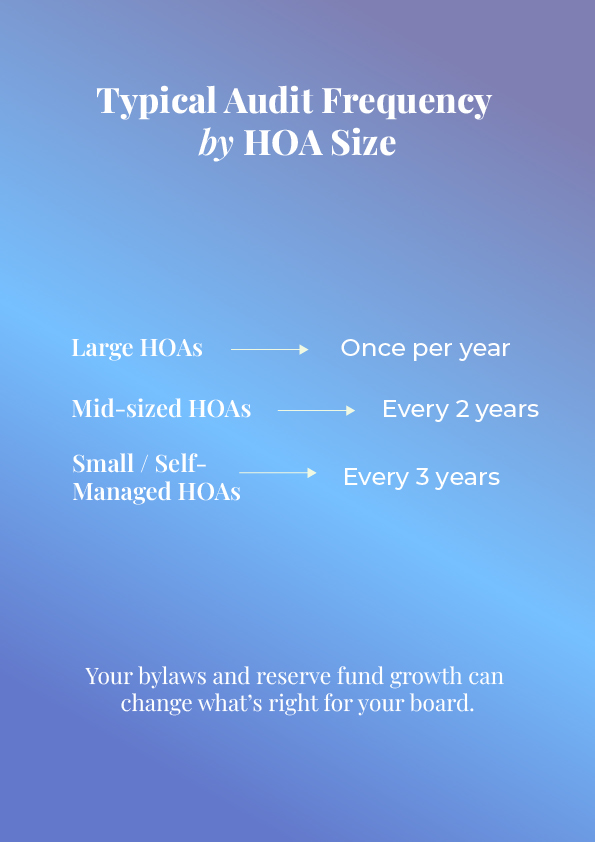 Some boards run an audit every year, while others stretch it out over two or three years. Other HOAs don’t know when they are supposed to do it; they just wait until something doesn’t feel quite right.
