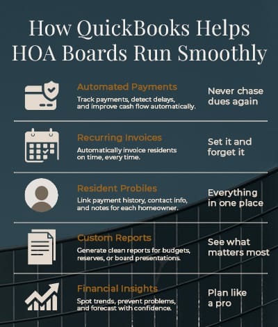 While QuickBooks is not exclusively designed with HOAs in mind, it does offer customizations that allow it to function for small- and even medium-size HOAs. You may have to bring in a specialist to do the initial setup, but then your board can have the custom dashboards and reports necessary to run your HOA.